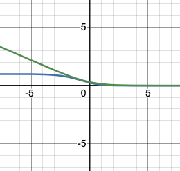 그래프로 확인해 보자. 파란색 그래프가 $(\frac{1}{1+e^{-w}}-1)^2$, 빨간색 그래프가 $-\log{\frac{1}{1+e^{-w}}}$이다.