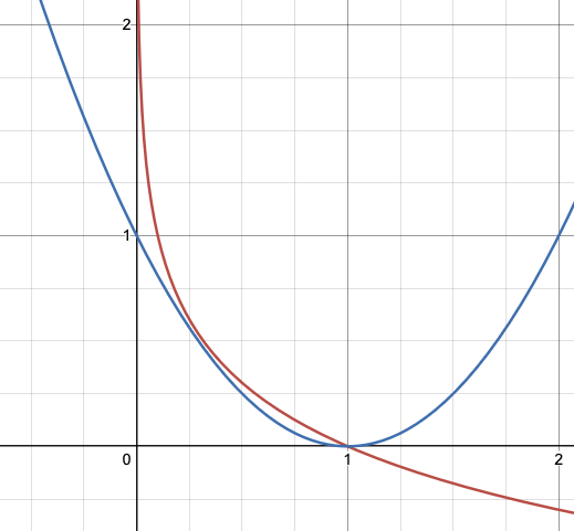 위 그래프에서 파란색이 $(q-1)^2$이며 빨간색이 $-\log{q}$이다.