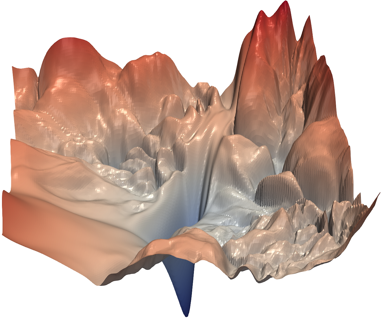 이를 사용하면 Loss landscape 현상으로부터 벗어날 수 있다. 아래 사진이 skip connection을 이용했을 때의 loss function 모양이다.