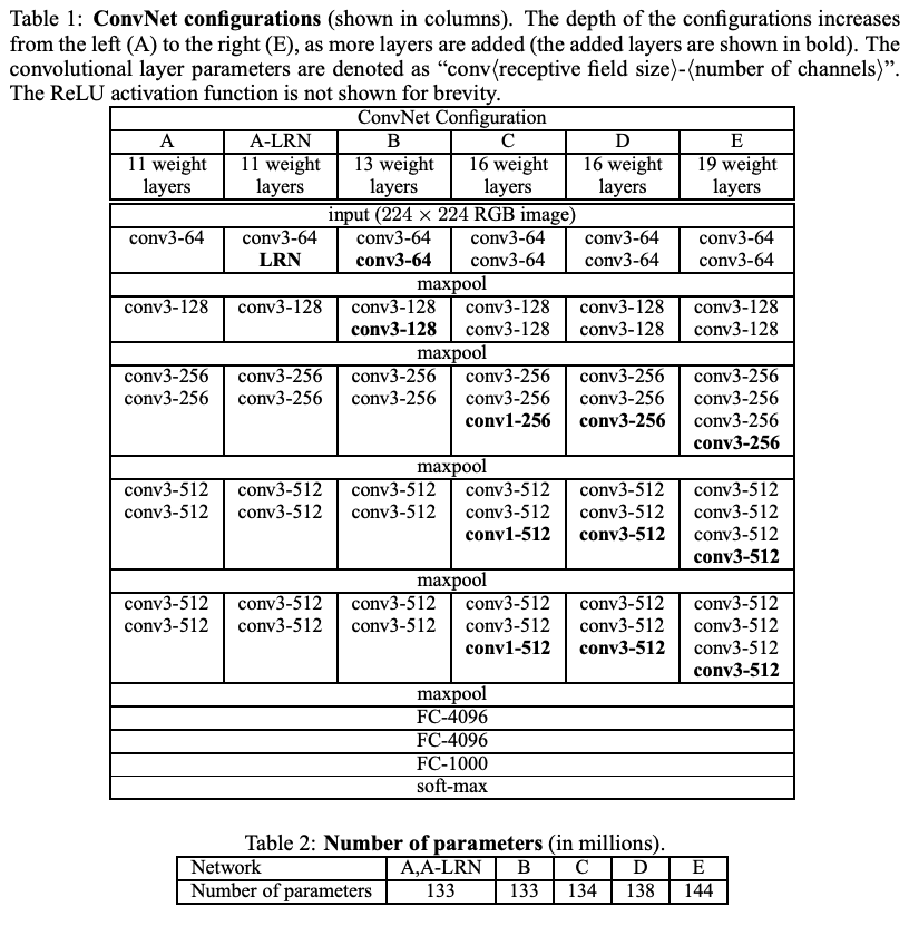 VGG net의 골자인 첫번째 구조를 table로 나타낸 것이 위 표의 D 부분이다. 해당 부분에 대해 순서대로 이해해 보겠다.