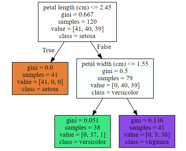 위 그림은 depth=2 상태로 완성된 의사결정트리이다.