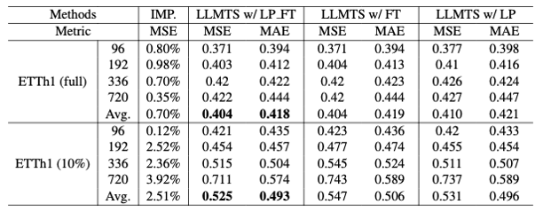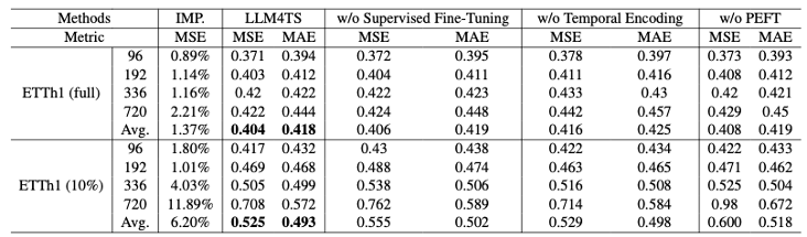 - 실험 결과, LLM4TS는 Long-term time-series forecasting과 입력 데이터로부터 유용하고 의미 있는 표현을 추출하여 학습하는 Representation learning에서 좋은 성능을 보이며 few-shot 상황에서도 좋은 성능을 보임을 증명하였다.