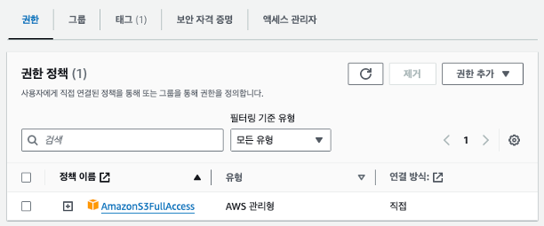 앞서 생성했던 User의 권한 -> 권한 정책 -> 권한 추가 -> AmazonS3FullAccess 권한으로 추가