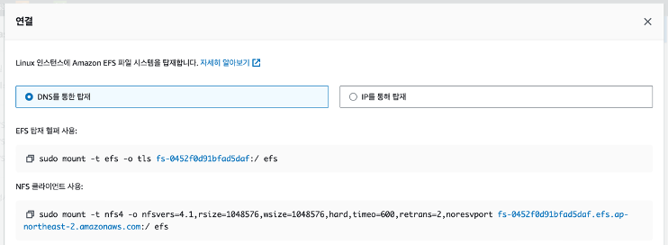 EFS -> 연결 에서 NFS 클라이언트 사용 커맨드를 복사하여 EC2에서 실행시킨다.