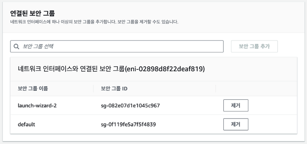 미리 생성해놨던 EC2 인스턴스의 보안 그룹을 아래와 같이 launch-wizard-n (n에 해당하는 숫자는 상관 없다.) 과 default 두 개로 설정한다.