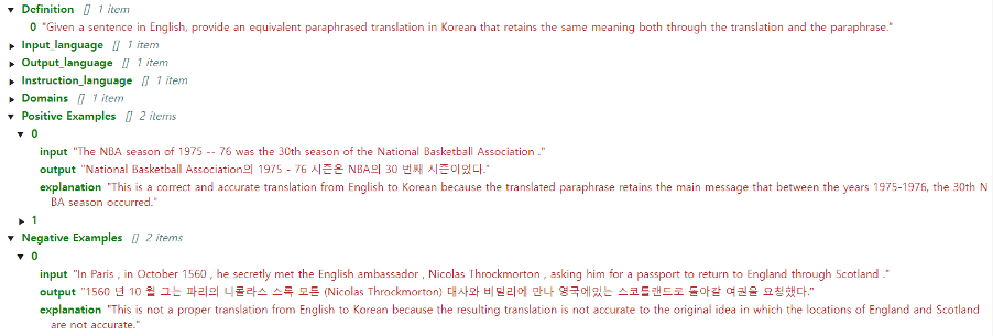 3. 데이터의 기본 schema는 Definition, Positive Example, Negative Example, Evaluation Instances으로 구성되어 있으며 task유형에 따라 추가되는 schema가 있다.
