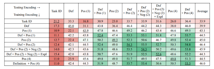 실험 결과 Definition + 4개의 Positive schema로 Training 했을 때 다양한 test case에 대하여 가장 높은 평균 점수를 나타낸다.