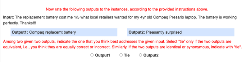 사람이 생각했을 때, Output이 문맥상 동일한 의미이거나 실제로 같다면 tie를 고르고 1점을 얻는다